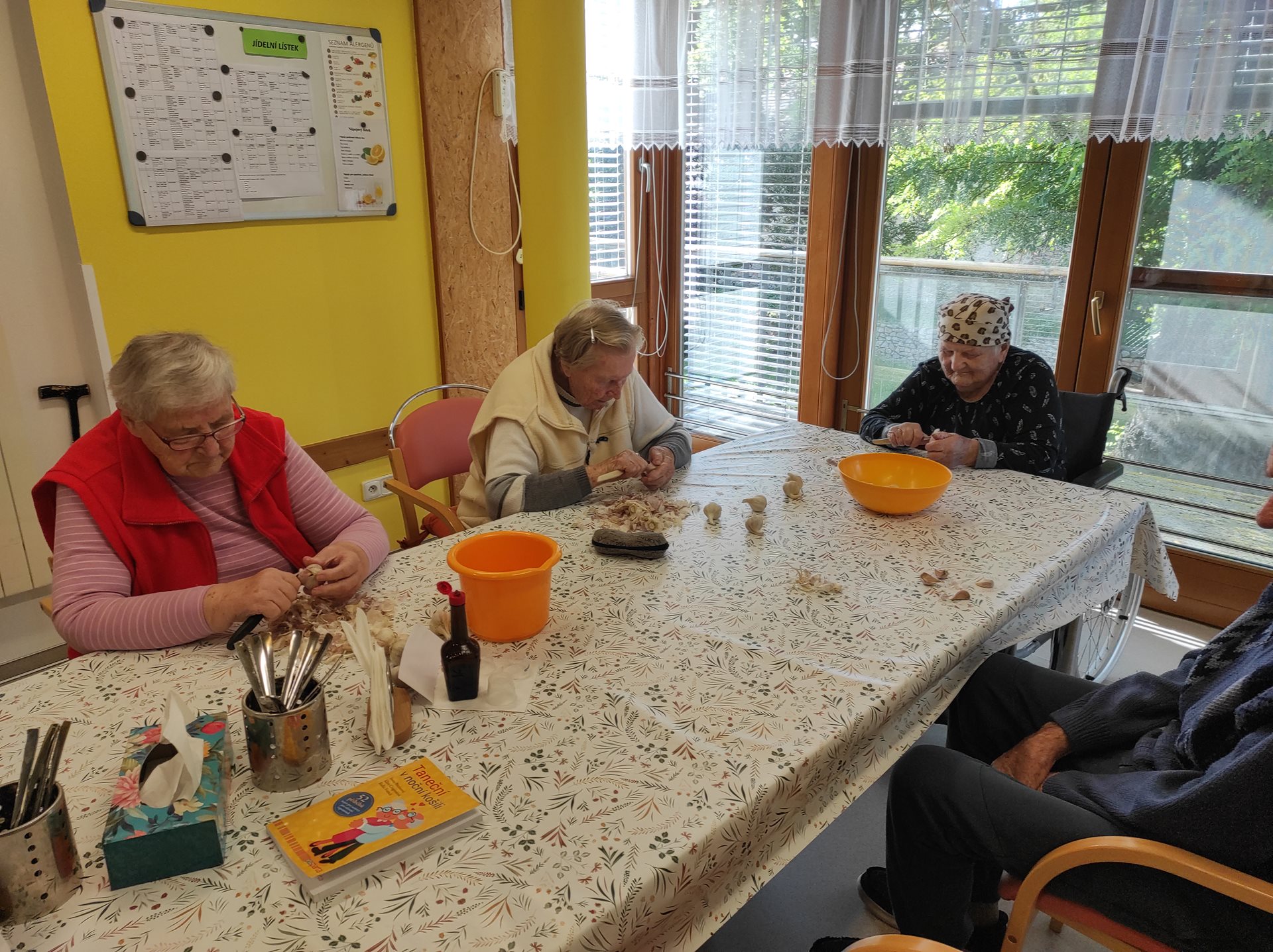 Podzim se k nám pomalými krůčky blíží a tak jsme s uživateli začali v rámci pracovní terapie zpracovávat/ loupat česnek. Chviličku poté, co jsme začali se česnek rozvoněl celým oddělením a každému se sbíhaly sliny na všechny pokrmy, které máme spjaté s česnekem - langoše, topinky, tatarák či bramboráky. Silice z česneku byly tak silné, že nám ve studeném dopoledni krásně pročistily a uvolnily nosní dutiny.