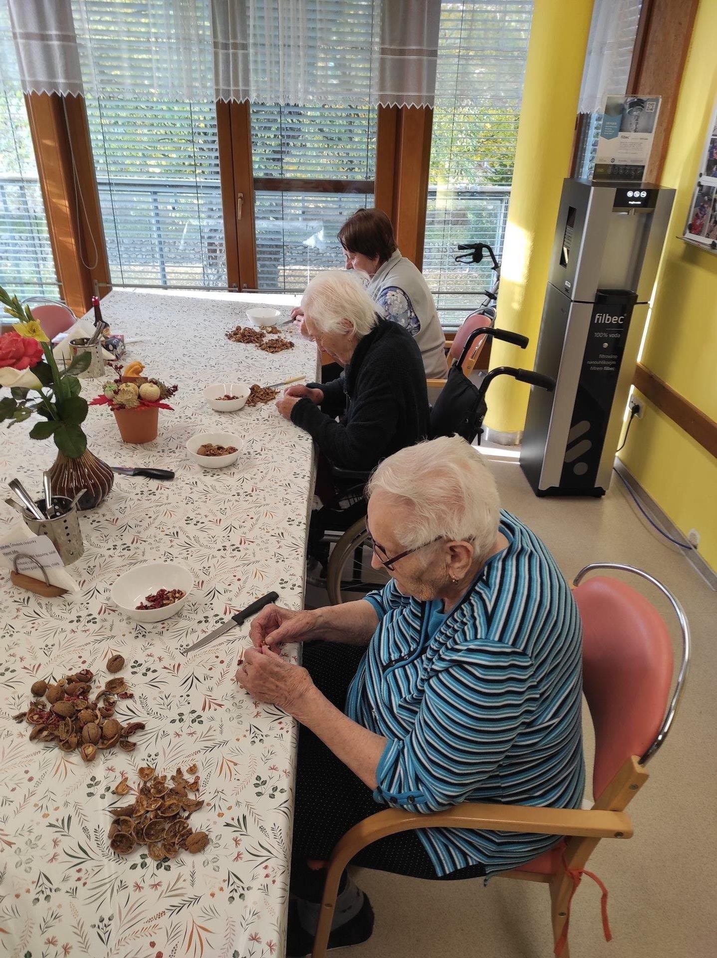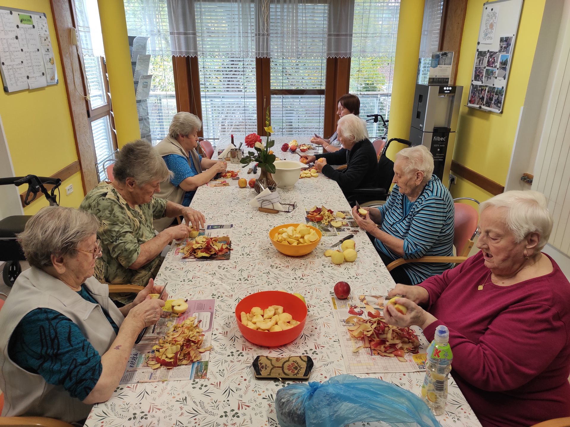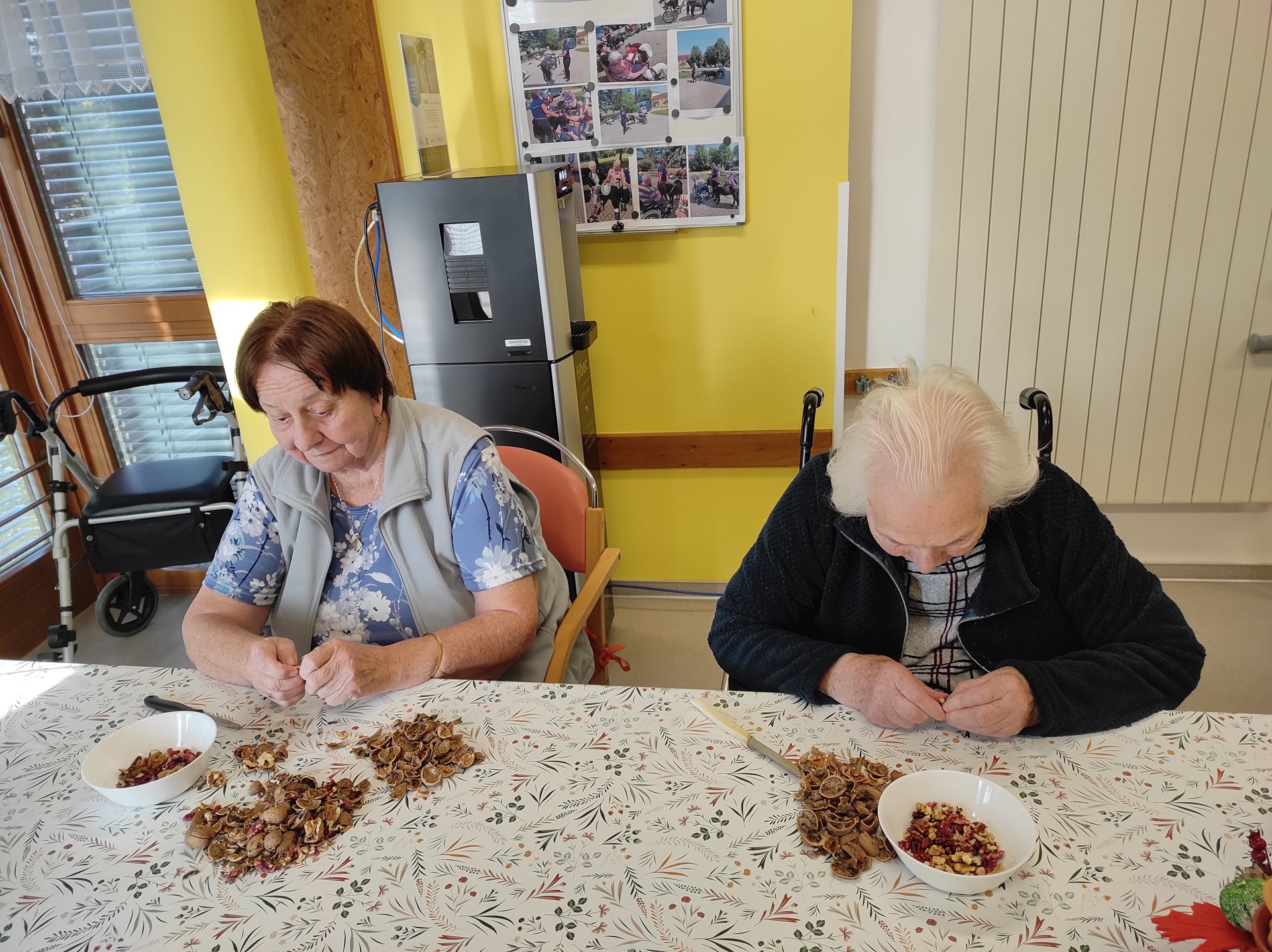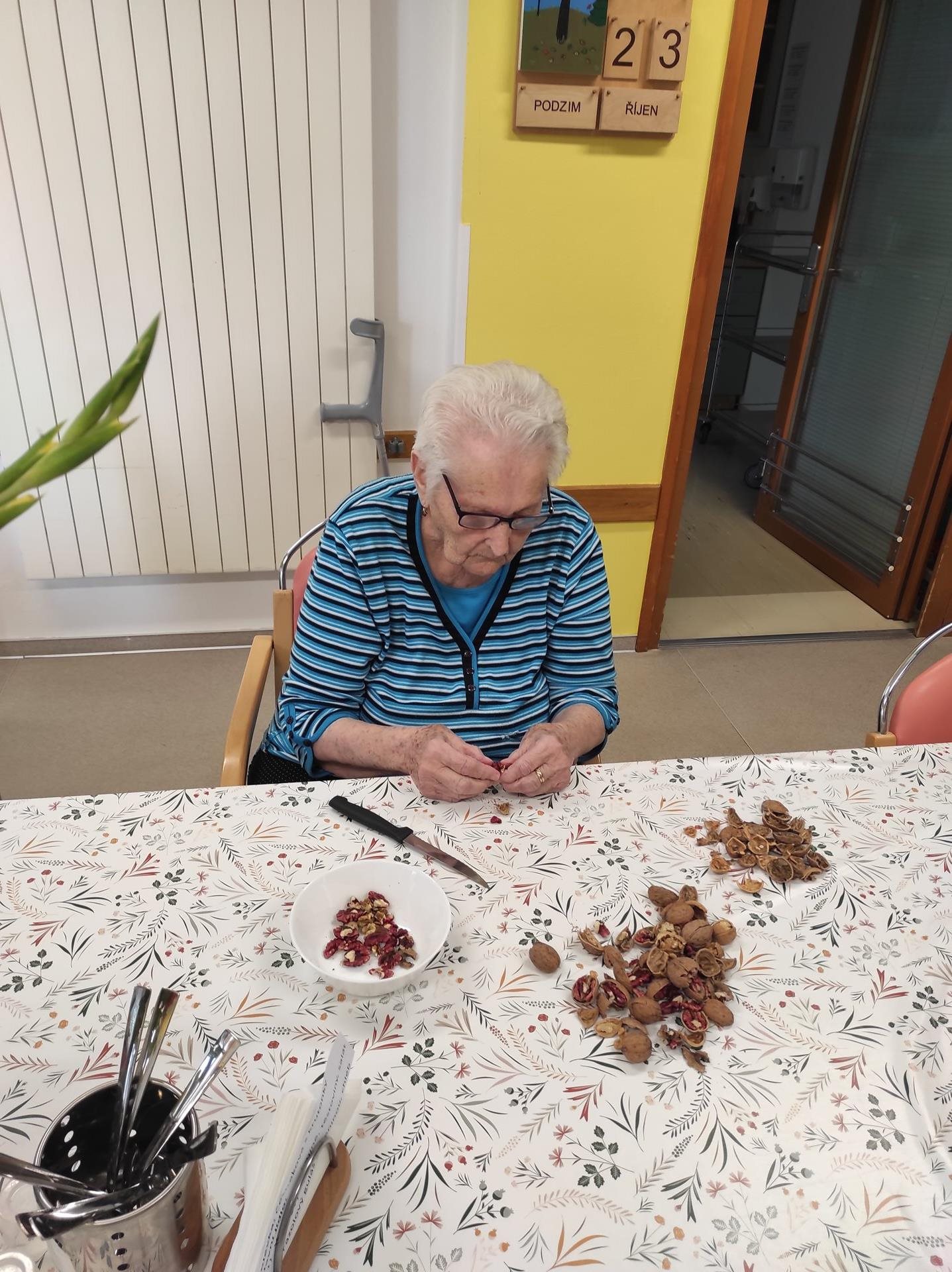 Tento týden jsme s uživatelkami v rámci skupinové aktivizace zpracovávaly velkou spoustu jablek, strouhaly a krájely jsme je na větší i menší kousky, aby se posléze mohly použít na štrúdl, nepečený jablečný dort či jen na jablečno-pudinkový dezert. Myslíme také na to, že cca za 2 měsíce budeme slavit Vánoce, a tak jsme se pustily do vyloupávání ořechů na vánoční cukroví. Při práci nám hrála lidová a dechová hudba z rádia a vzduchem se linula vůně zpracováváných potravin. S uživatelkami jsme si i potrénovaly paměť nad tím, do jakého cukroví či pokrmů se ořechy dávají. Bylo to hezky strávené voňavé dopoledne.