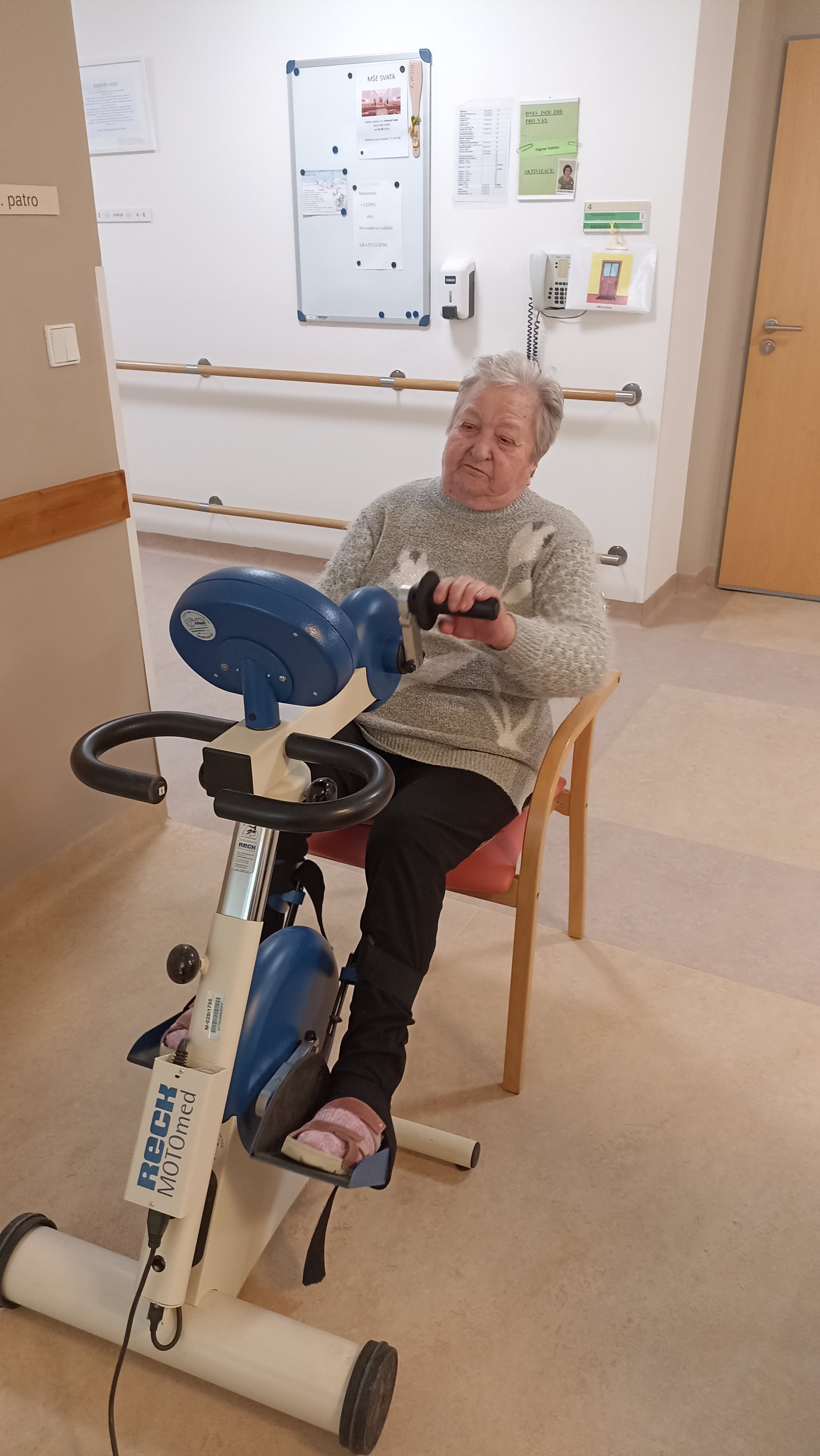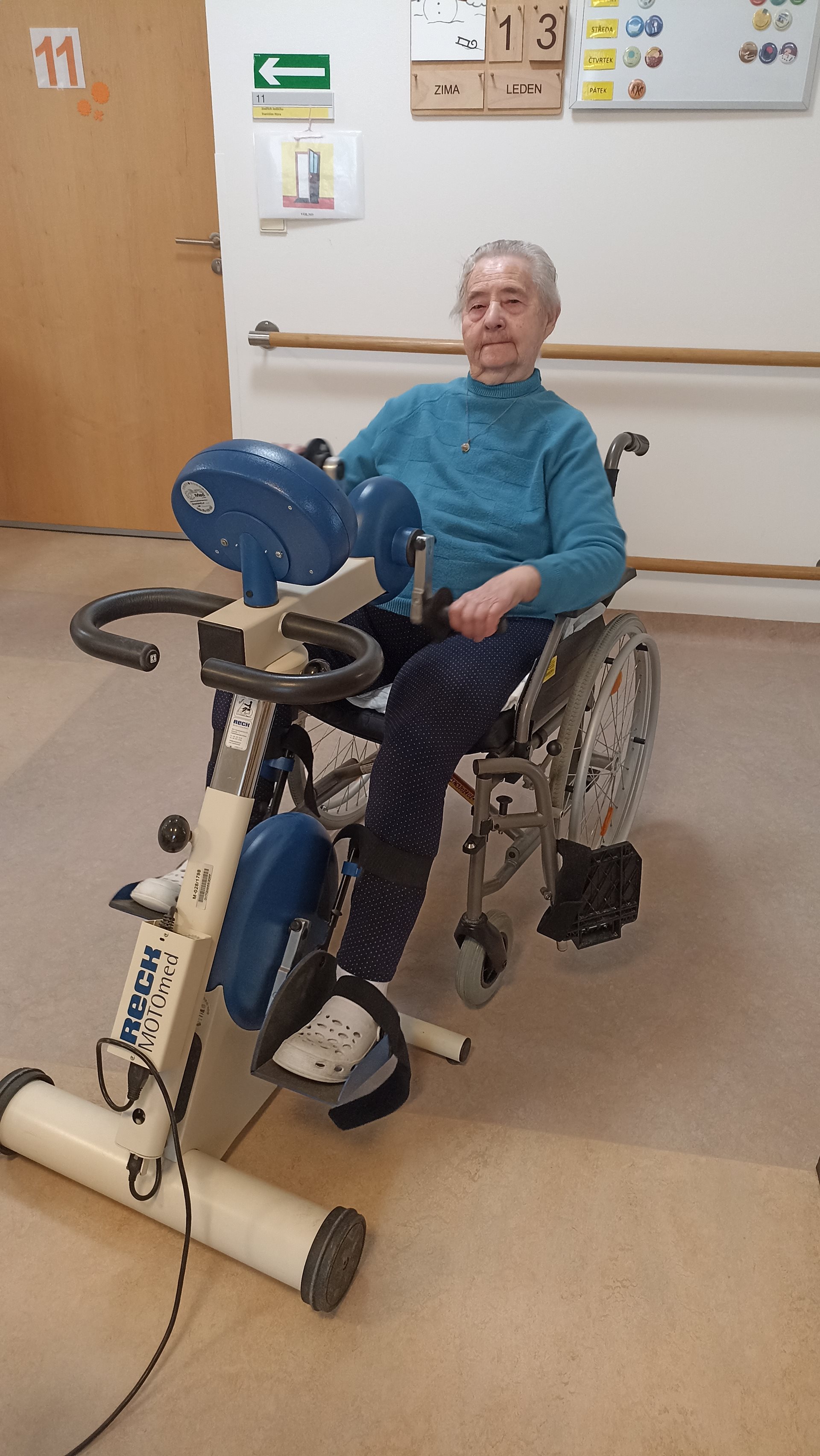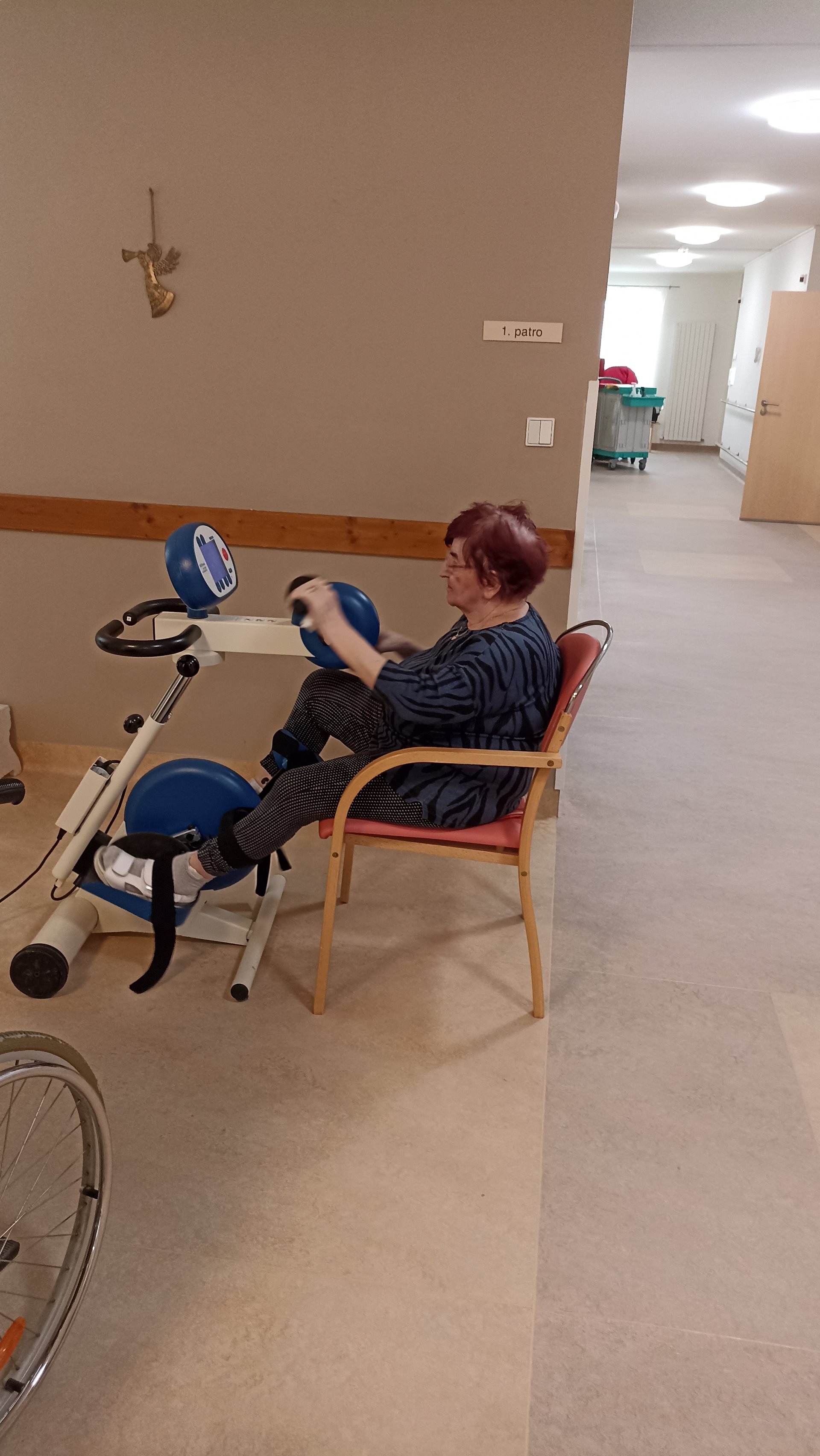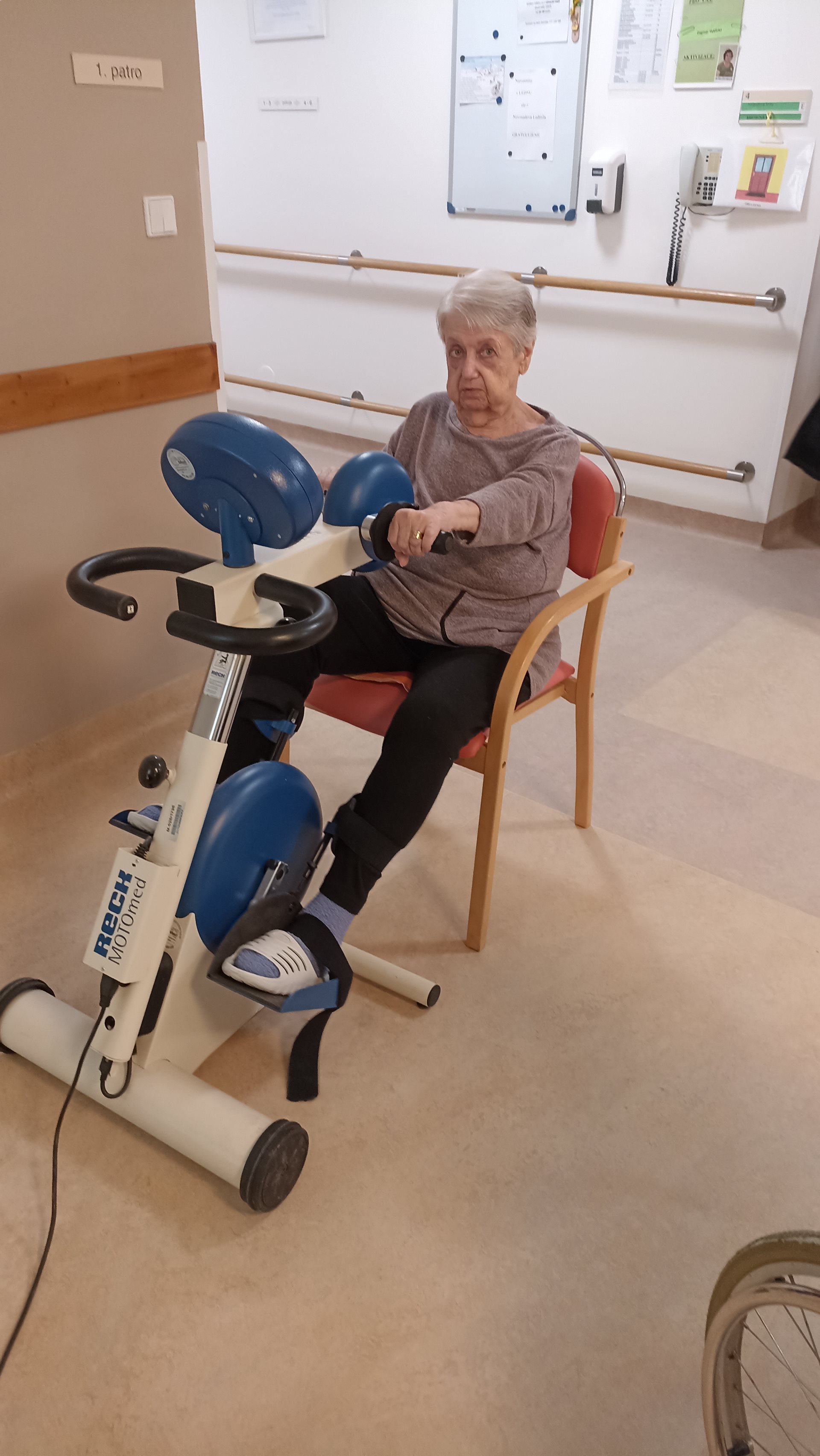 Šlapání na motomedu patří mezi oblíbené a bezpečné pohybové aktivity, které pravidelně zařazujeme do našich aktivit. Motomed umožňuje přirozený pohyb dolních i horních končetin, a to s ohledem na individuální možnosti každého uživatele. Aktivita napomáhá procvičení svalstva, zlepšení rozsahu pohybu a jemnému protažení celého těla. Pravidelné šlapání podporuje také krevní oběh a přispívá k celkové fyzické kondici. Součástí cvičení je zároveň i trénink paměti a pozornosti. Během šlapání si s uživateli povídáme, připomínáme si známé události, písně či témata z jejich života, čímž přirozeně podporujeme kognitivní funkce. Aktivita probíhá v klidné atmosféře, která motivuje k pohybu a posiluje pocit jistoty a radosti z vlastní aktivity.