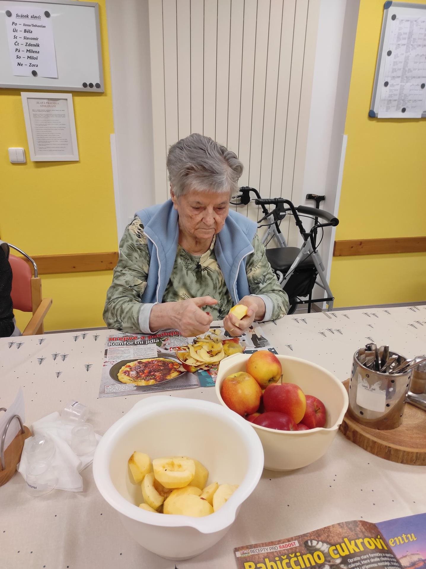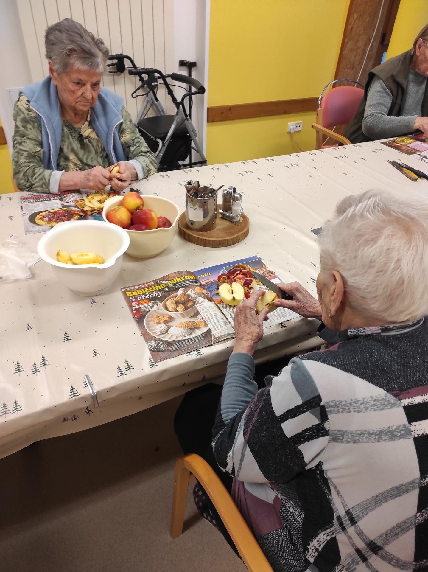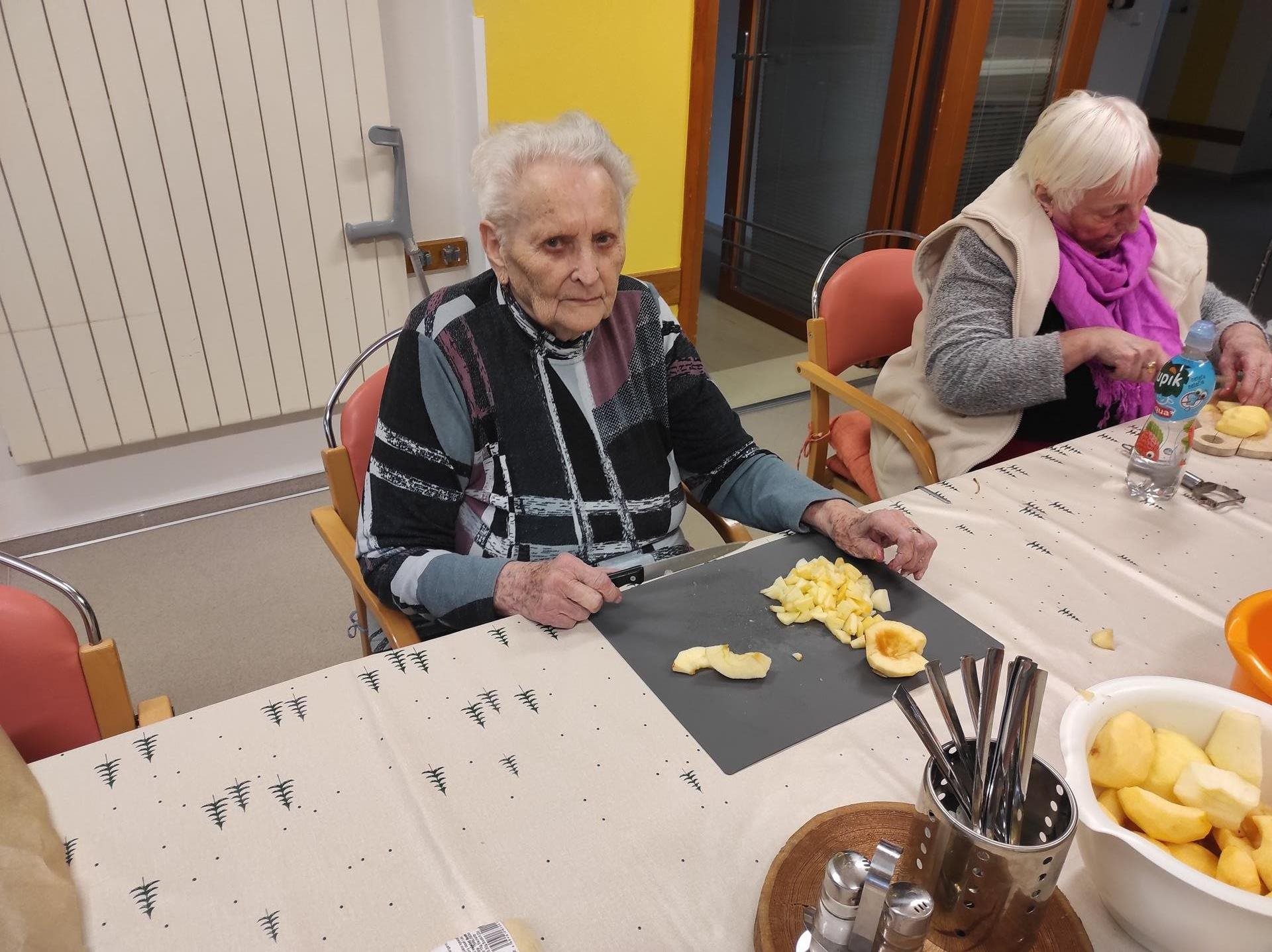 Pavilonem A se ve čtvrtek rozléhal zpěv lidovek a vůně jablek a skořice – tipujete dobře – peklo se! S uživatelkami jsme společně očistily jablka, které následně nakrájely na malé kostičky a rozprostřely na rozválené listové těsto. Vzduchem se mj. linula vůně rozinek a vanilkového cukru. Dezert v podobě zlatavého štrúdlu si pak společně uživatelky vychutnaly u odpolední kávy.