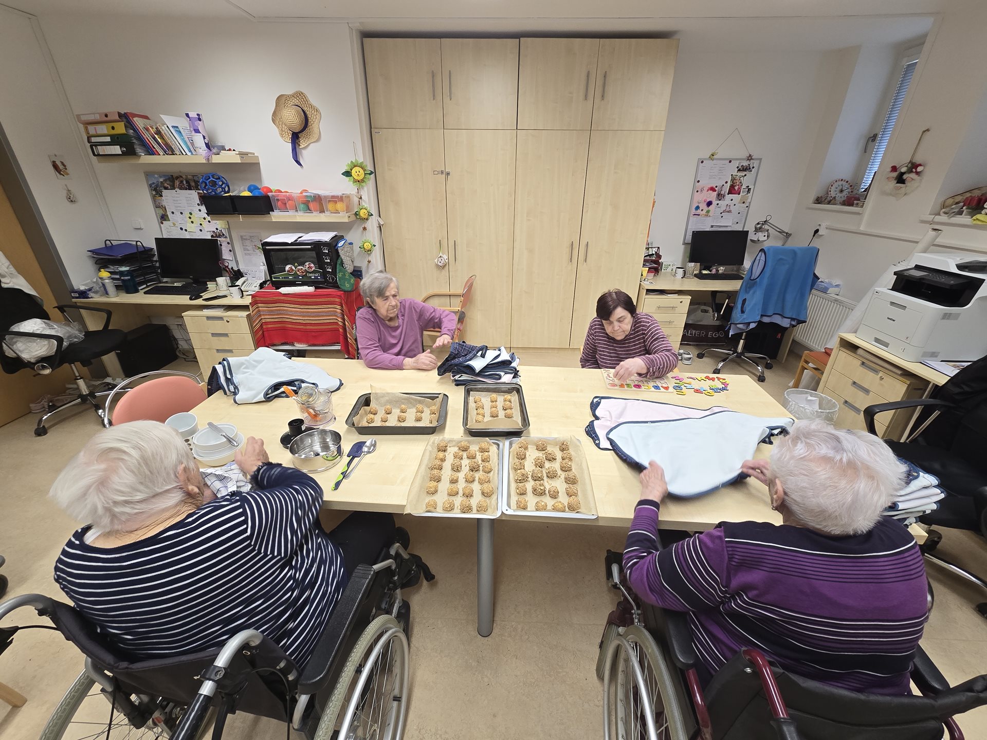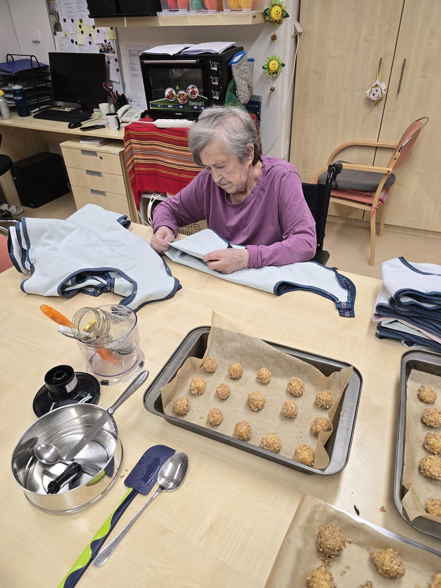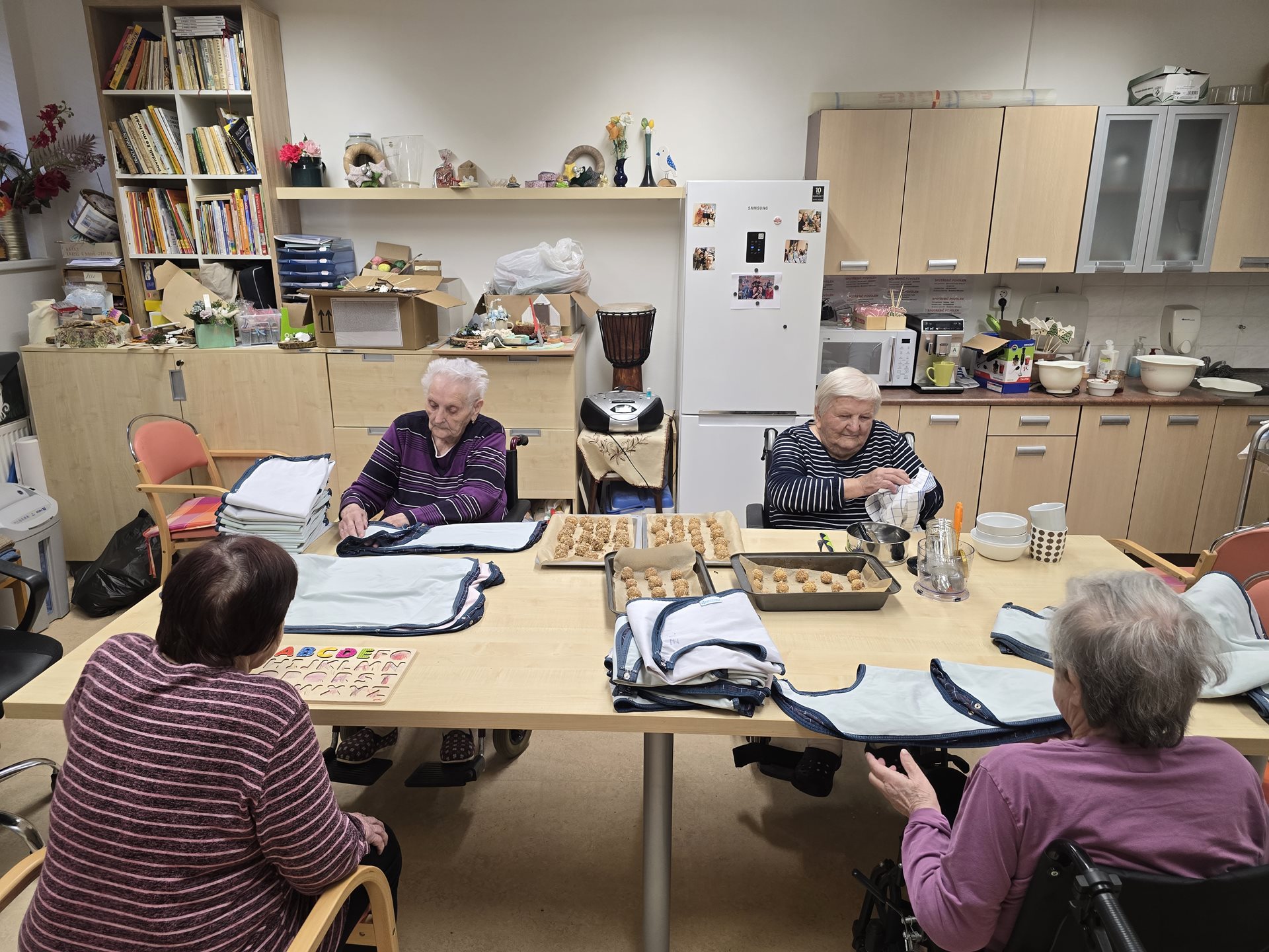 Čtvrteční dopoledne jsme s uživatelkami strávily pečením ořechových kuliček, u kterého jsme si zazpívaly koledy. Po pečení kuliček se uživatelky ještě pustily do skládání prostírek a motání obinadel na bandáže nohou. Tato pro někoho banalita naše uživatelky velmi baví a o práci se vyloženě „perou“.