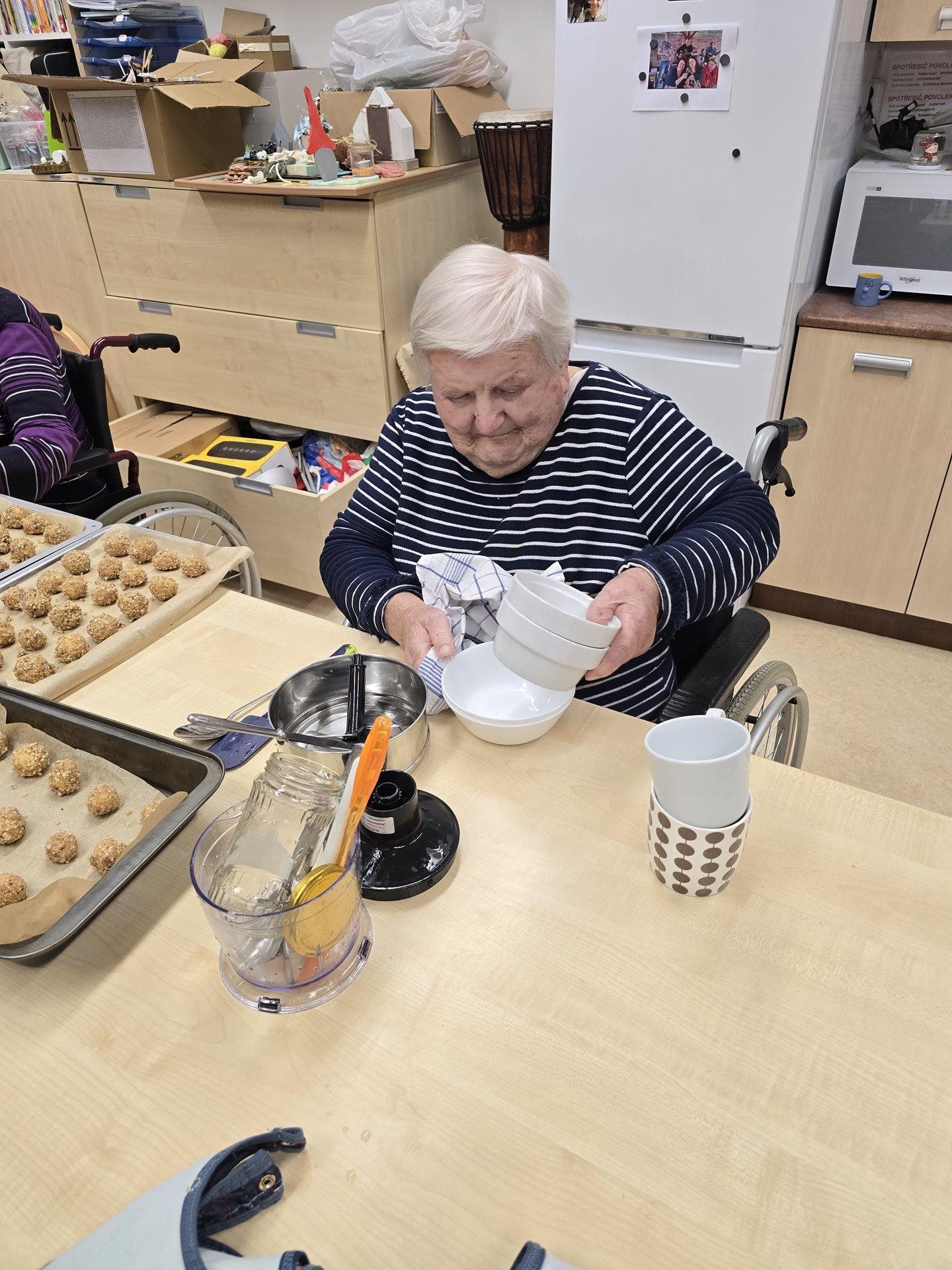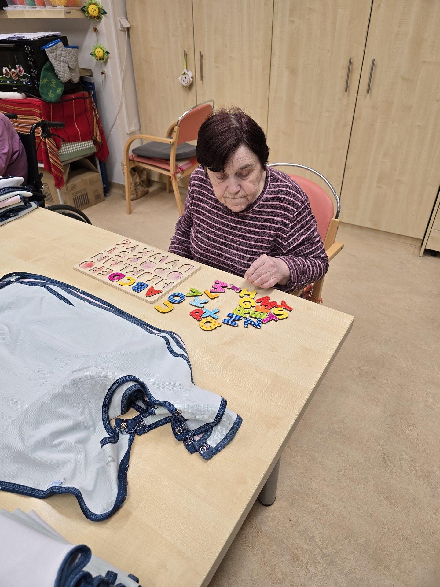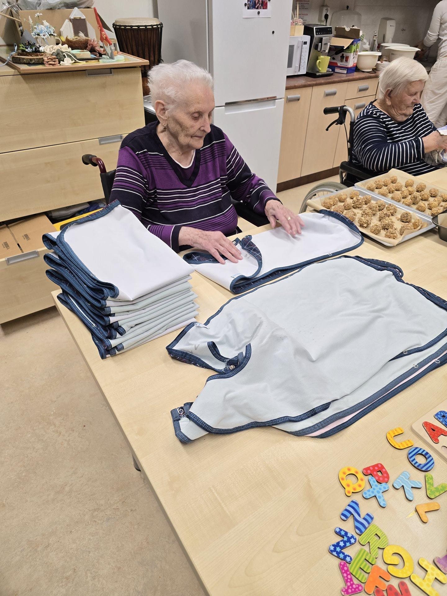 Čtvrteční dopoledne jsme s uživatelkami strávily pečením ořechových kuliček, u kterého jsme si zazpívaly koledy. Po pečení kuliček se uživatelky ještě pustily do skládání prostírek a motání obinadel na bandáže nohou. Tato pro někoho banalita naše uživatelky velmi baví a o práci se vyloženě „perou“.