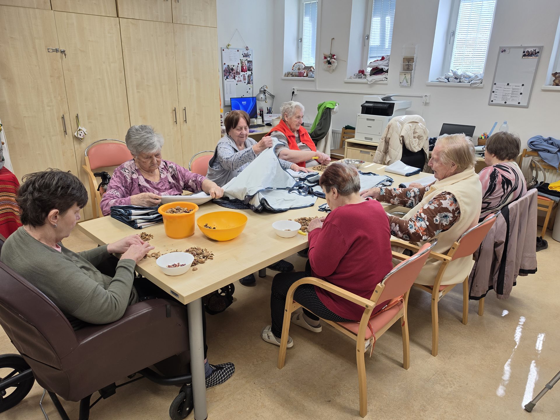 Ani po Velikonocích jsme s uživatelkami nezahálely a ve čtvrtek jsme se vesele vrhly na vyloupávání ořechů ze skořápek a skládání obrovské hromady prostírek, které se, čistě vyprané, nahromadily během velikonočních svátků v prádelně. Příjemné dopoledne doladil poslech populární hudby z dob mládí uživatelek, které si známé písně během práce popěvovaly.