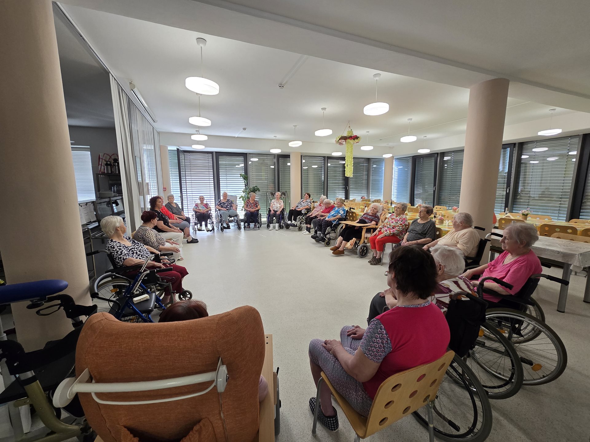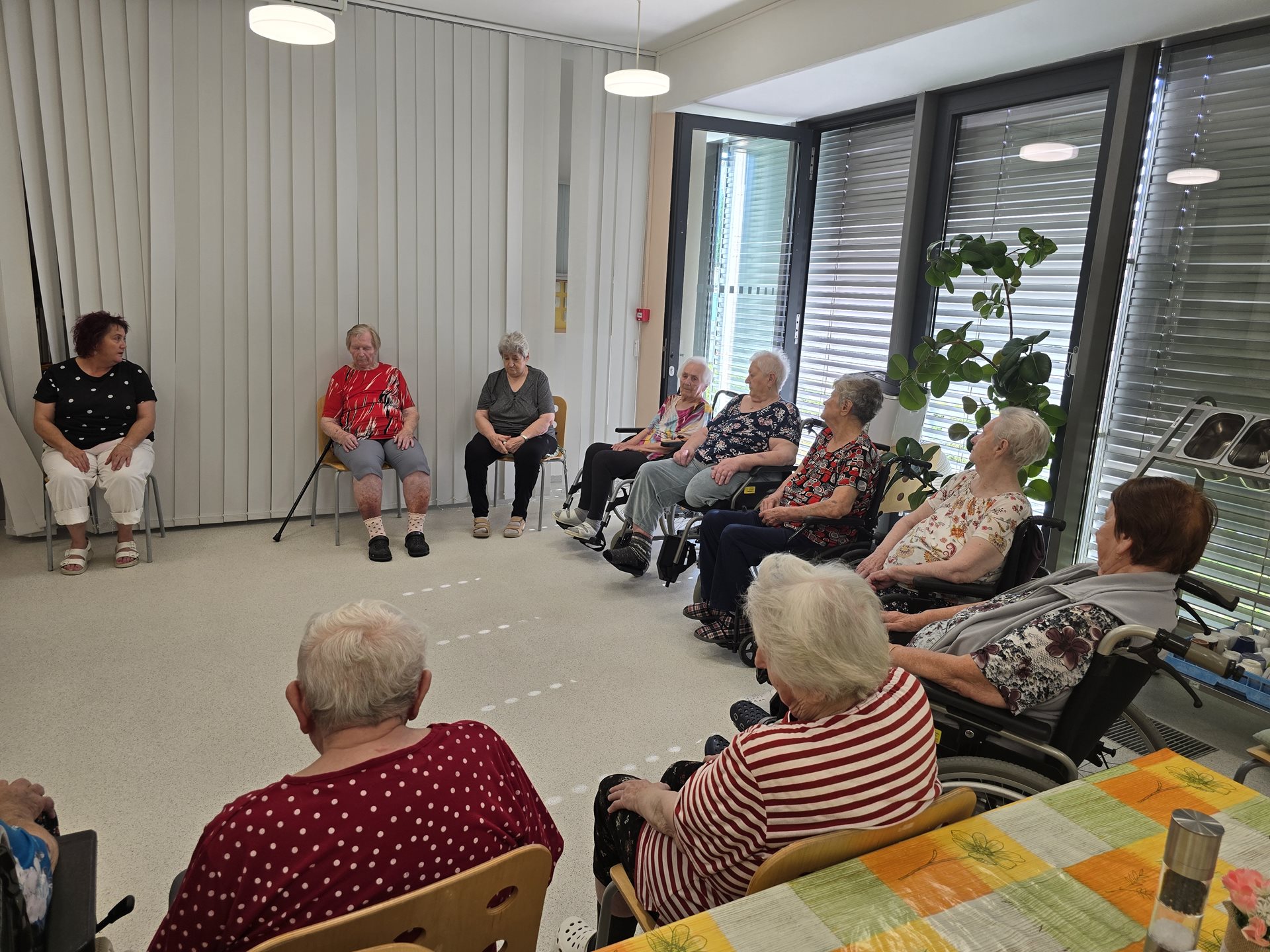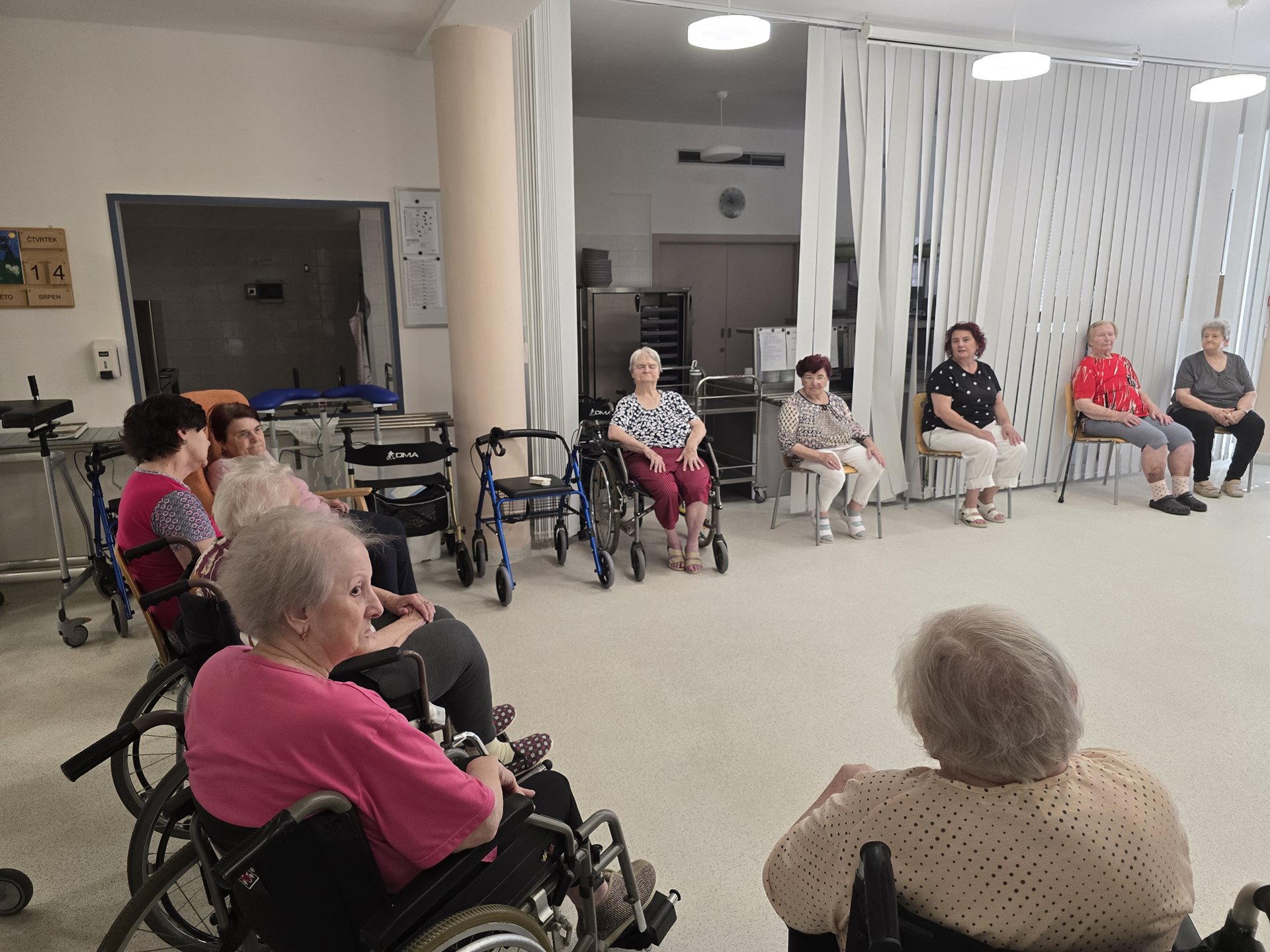 V našem domově pro seniory probíhá každý týden pravidelné skupinové cvičení, které je oblíbenou a nedílnou součástí volnočasových aktivit. Uživatelé se při něm setkávají v příjemném prostředí, kde společně procvičují různé partie těla a protahují. Cvičení je přizpůsobeno individuálním možnostem každého účastníka a probíhá formou jednoduchých a nenáročných pohybů, často s využitím cvičebních pomůcek, jako jsou míčky, gumy či kroužky. Tyto pomůcky podporují nejen pohybovou aktivitu, ale také jemnou motoriku a koordinaci. Pravidelný pohyb má pozitivní vliv na fyzickou kondici, zlepšuje náladu a posiluje celkovou vitalitu. Naše setkávání jsou navíc příležitostí k přátelskému povídání a sdílení radosti z aktivního času stráveného společně.