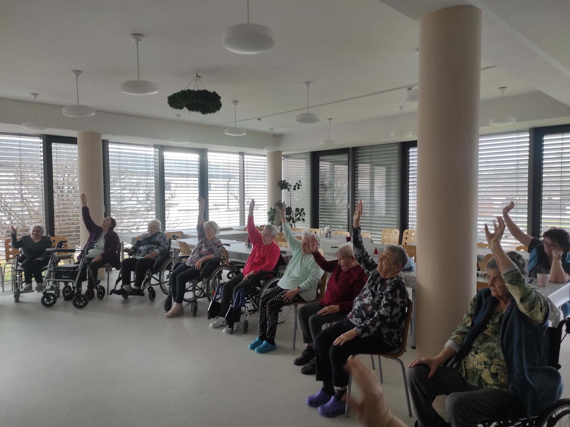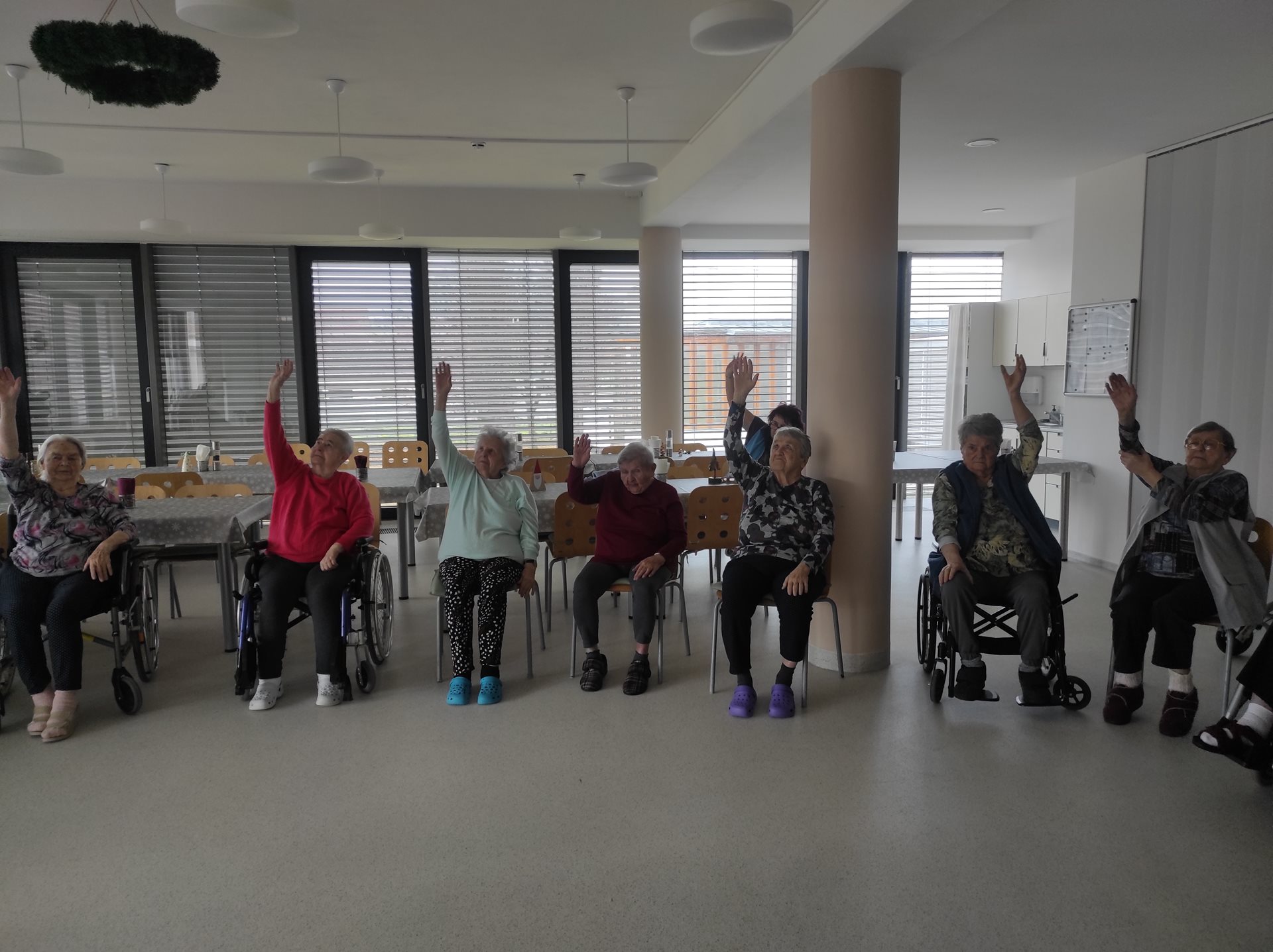 Jako každý pátek, tak i dnes naše uživatelky čekalo oblíbené skupinové cvičení, na které se vždy celý týden těší. Při tomto cvičení mají uživatelky možnost procvičit si a protáhnout celé své tělo - od hlavy až k patě. Tak, jako vždy při skupinovém cvičení jsou uživatelkám rozdány i cvičící pomůcky a dnes byly uživatelkám rozdány gumové kroužky. S gumovými kroužky je možné provádět spoustu různých cviků - ať už na procvičení rukou nebo třeba i nohou, uživatelky si tak cvičení užily ještě více. Uživatelky ze skupinového cvičení odcházely s úsměvem na rtech.