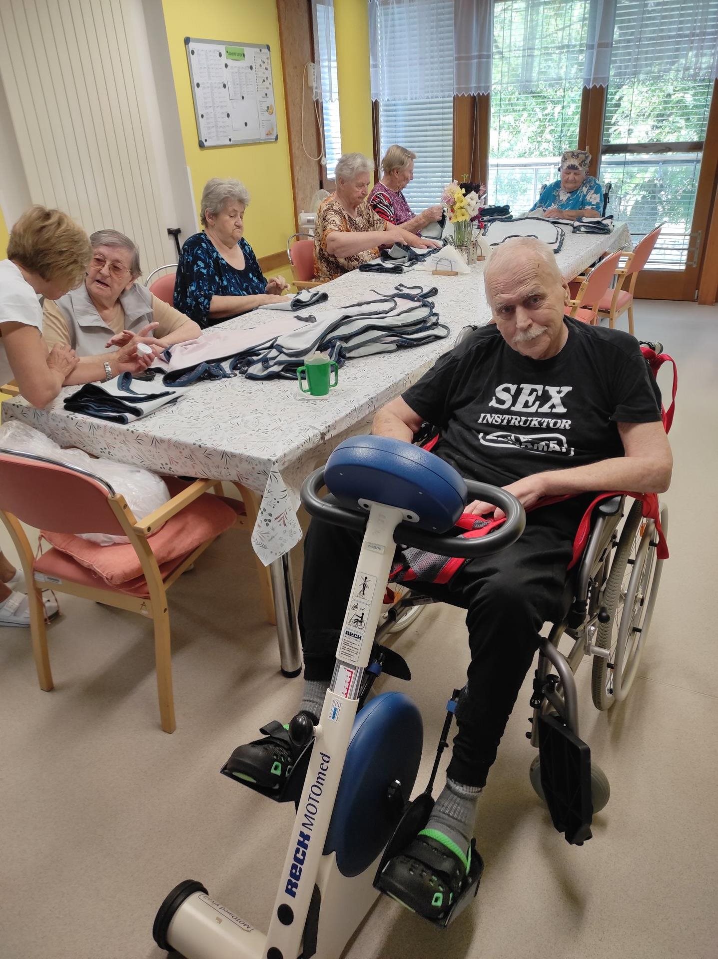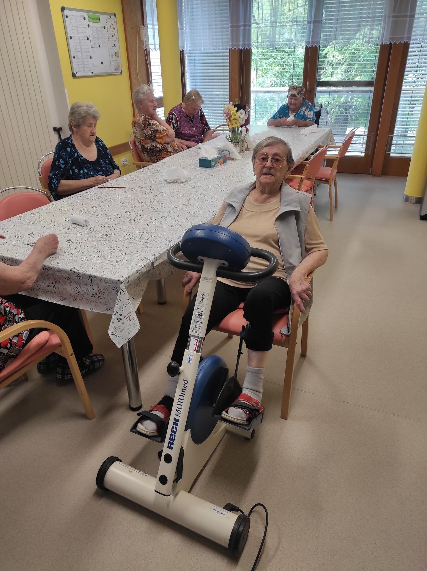 V rámci pohybové terapie chodí naši uživatelé pravidelně na páteční skupinová cvičení a zároveň mají možnost si protáhnout končetiny na tzv. MOTOmedu. Co to obnáší? MOTOmed je pohybový přístroj poháněný motorem, který byl vyvinut pro osoby s omezenou pohyblivostí a doplňuje fyzioterapeutická i ergoterapeutická opatření. Uživatelé mohou při tréninku sedět na vozíku nebo v křesle a díky přístroji, který umožňuje pasivní, motorem poháněný, i aktivní, motorem podporovaný, pohyb, dochází ke kompenzaci nedostatku pohybu a pomáhá zmírňovat následky, jako je ztuhlost kloubů, křeče či špatné zažívání.