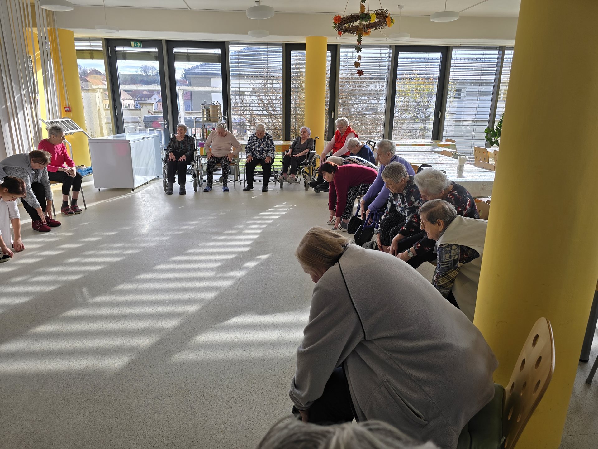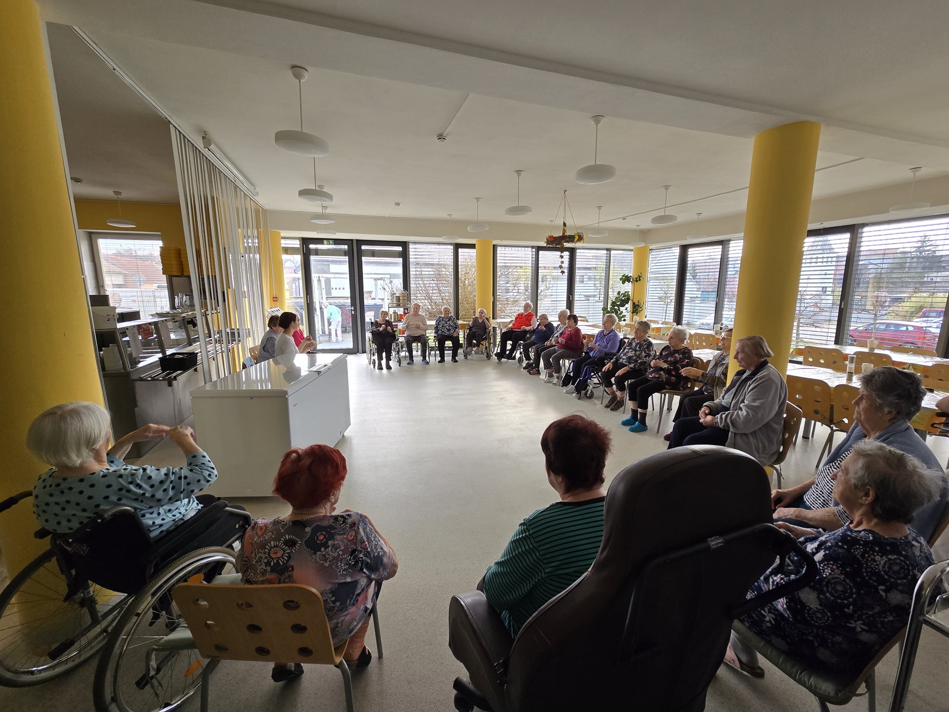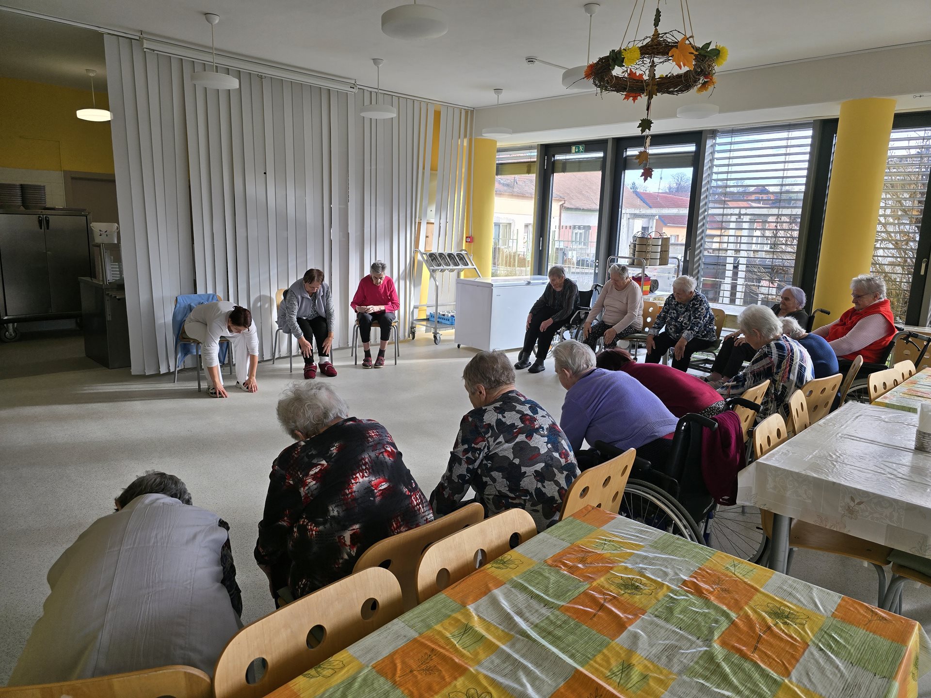 Pondělní dopoledne jsme s uživatelkami procvičily svá víkendem strnutá těla. Pomohla nám v tom i dechová a orofaciální cvičení i barevné kroužky. Tyto kroužky uživatelky mačkaly, „ždímaly“, kroužily na předloktí, házely do vzduchu apod.
