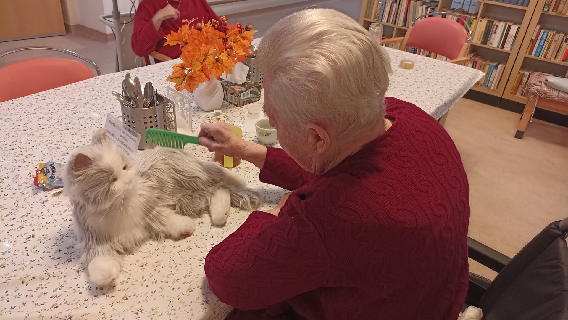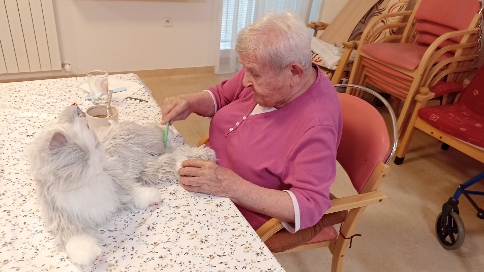 V našem domově pro seniory probíhá nová forma individuální terapie za využití interaktivní robotické kočky. Tato moderní pomůcka přináší uživatelům radost, zklidnění a pocit blízkosti. Kočka reaguje na dotek, přede, pohybuje se a vytváří tak dojem skutečného zvířete. Uživatelé s ní navazují kontakt, hladí ji a často si při tom vybavují vzpomínky na svá domácí zvířata. Terapie podporuje komunikaci, snižuje stres a napomáhá lepší náladě. Vhodná je zejména pro osoby s demencí, které na podněty zvířete reagují velmi pozitivně. Setkání s robotickou kočkou přináší do běžných dní uživatelů novou formu interakce, radosti a uvolnění.