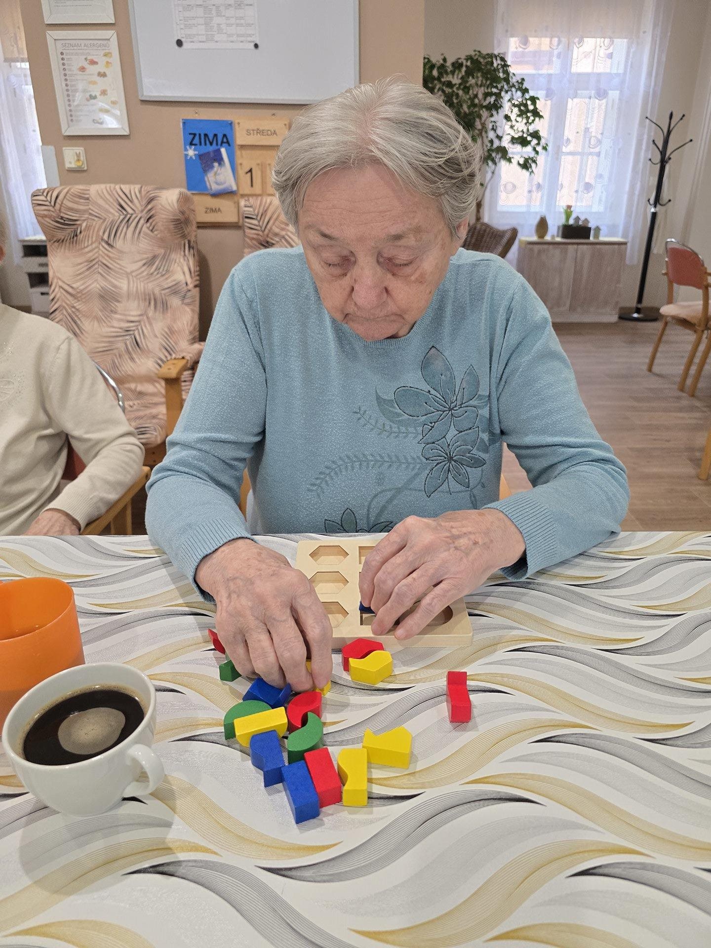 Ve středu dopoledne si uživatelky na pavilonu Z procvičily paměť prostřednictvím poznávání různých květin a bylin. Při této příležitosti jsme si všichni společně vykládali, jaké rostliny si uživatelky pěstovaly doma, a které mají nejradši. Během této aktivity si uživatelky procvičily také jemnou motoriku a to tak, že do dřevěné desky skládaly různé geometrické tvary - aby to všechno do sebe hezky zapadlo. Uživatelkám se středeční dopoledne moc líbilo a samozřejmě nechyběly ani vtipné chvilky, kdy jsme se všechny upřímně a od srdce zasmály.