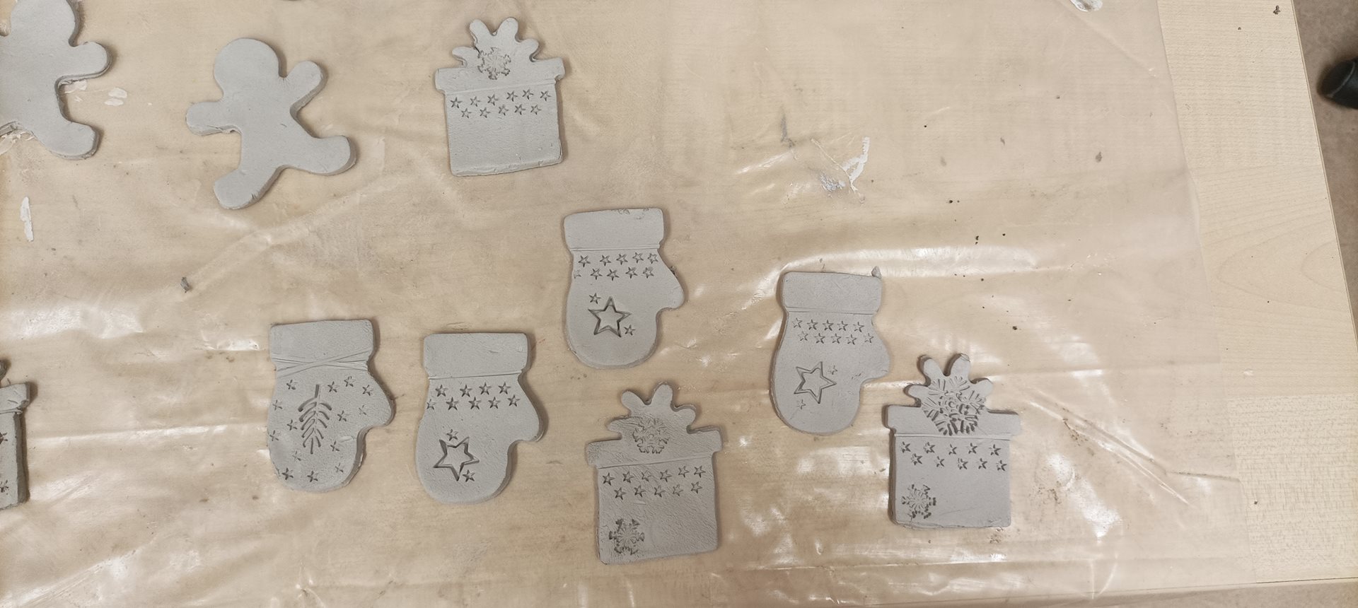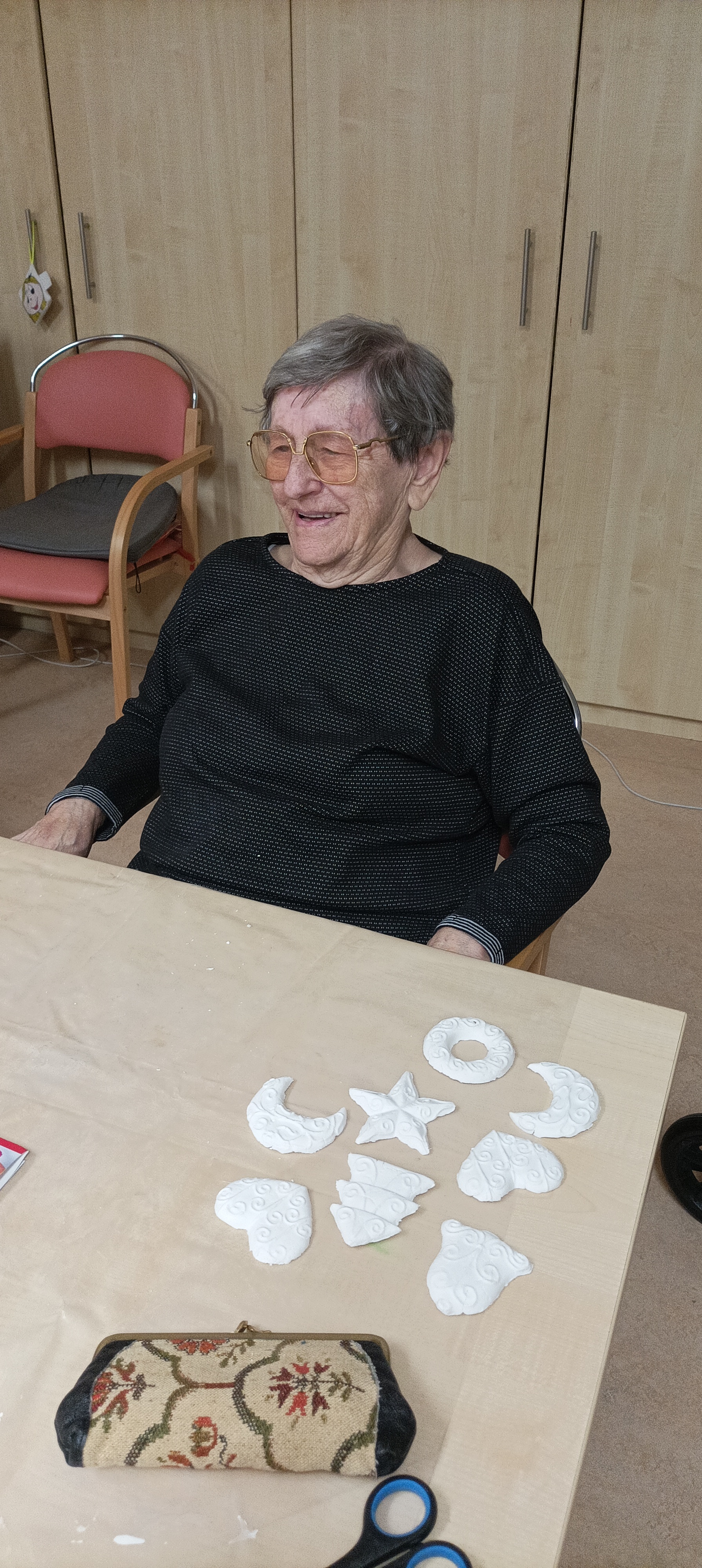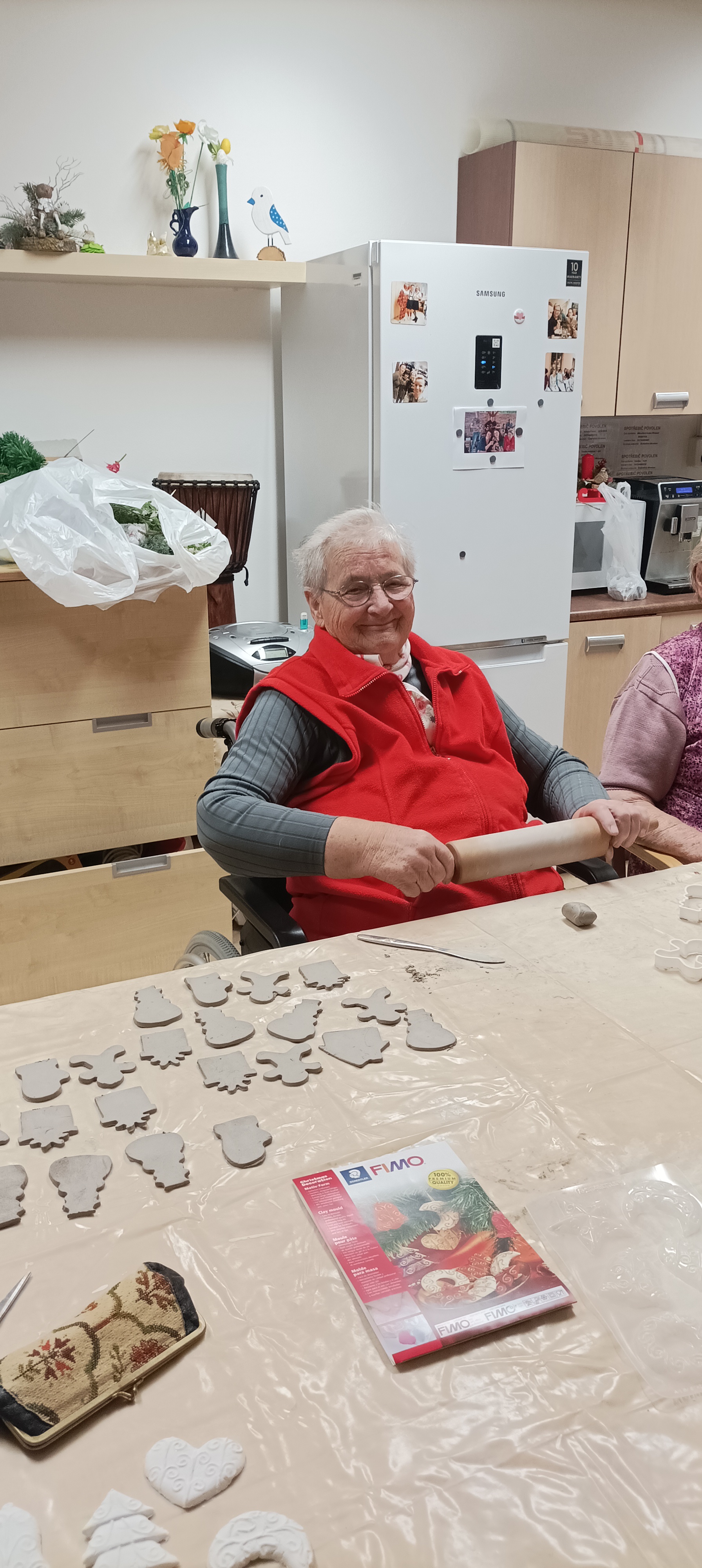 Středeční dopoledne jsme probudily své kreativní já a s uživatelkami jsme tvořily výrobky na vánoční jarmark. Bílou samotvrdnoucí hmotu uživatelky vmačkávaly do předem připravených silikonových forem a následně je vyklepávaly na stůl. Z keramické hlíny pak uživatelky vyválely placku, ze které pomocí vykrajovátek tvořily vánoční tvary (domečky, sněhuláky, dárky, rukavičky...). Poté, co byla všechna hmota spotřebována, mohly uživatelky dané výtvory ještě „dodekorovat“ různými tiskátky a raznicemi. Při poslechu hudby to byl příjemný závan Vánoc.