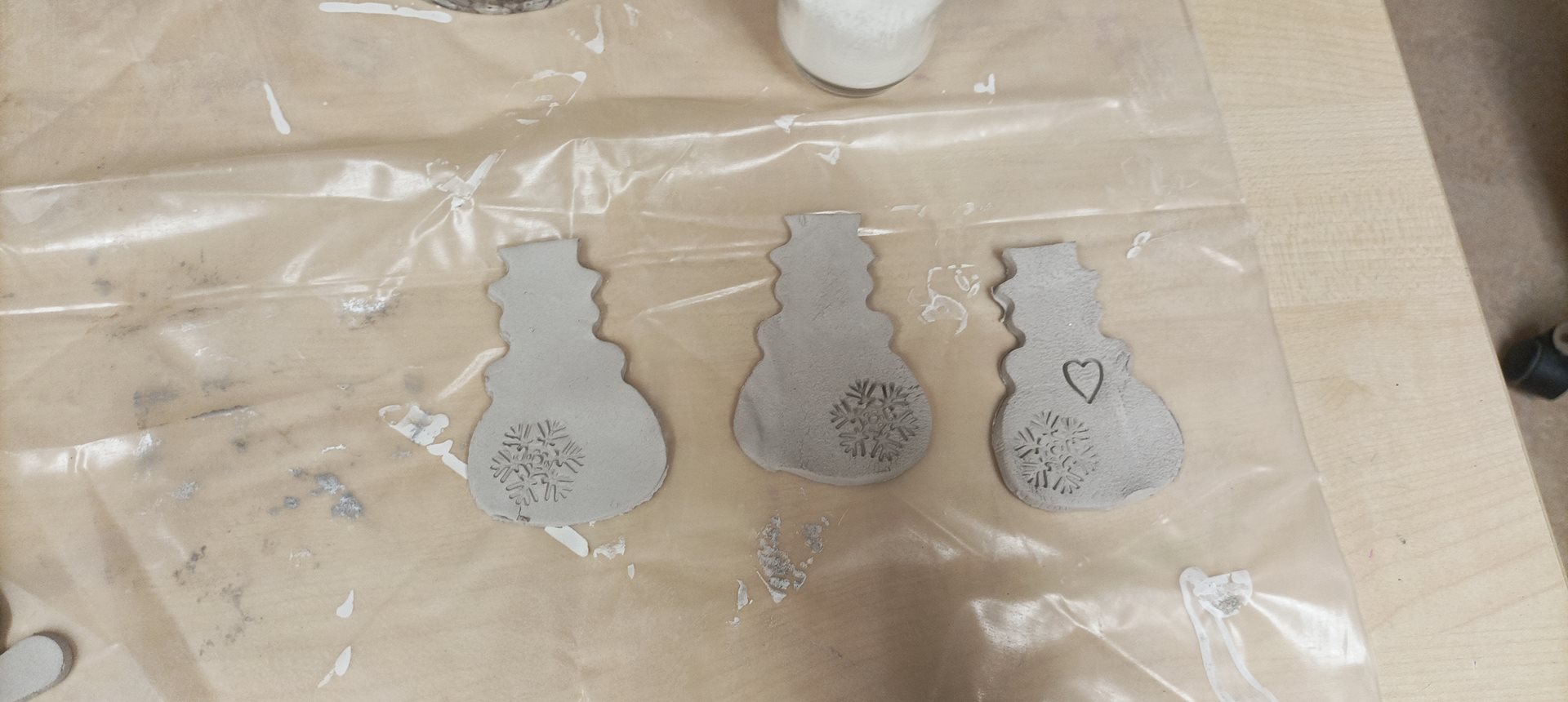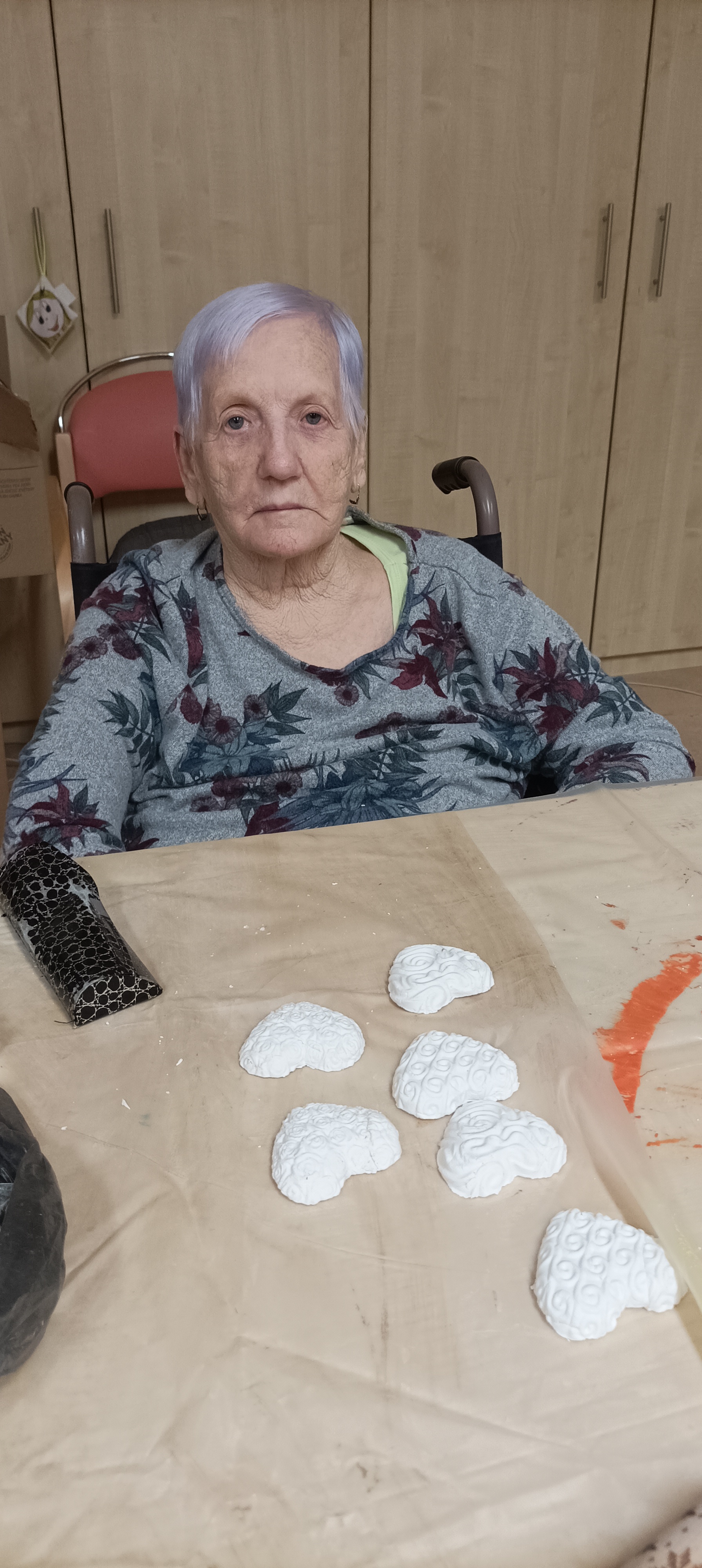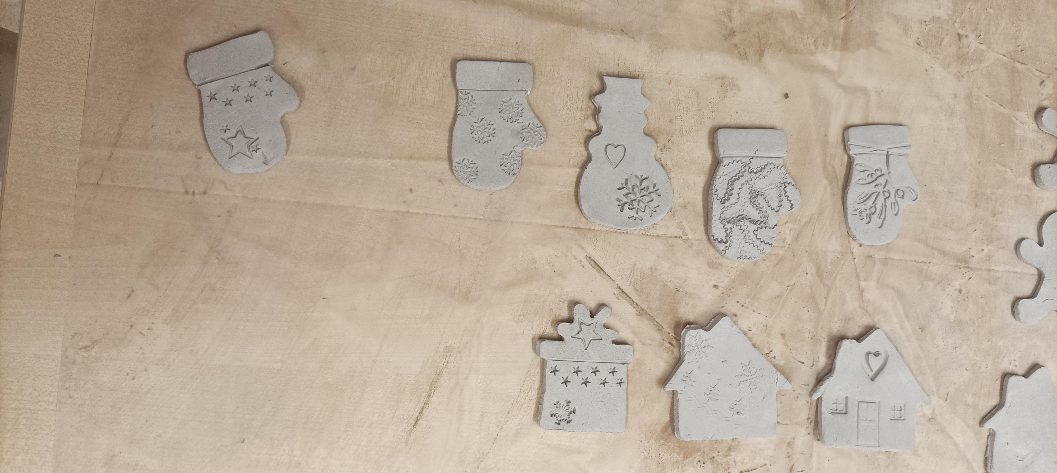 Středeční dopoledne jsme probudily své kreativní já a s uživatelkami jsme tvořily výrobky na vánoční jarmark. Bílou samotvrdnoucí hmotu uživatelky vmačkávaly do předem připravených silikonových forem a následně je vyklepávaly na stůl. Z keramické hlíny pak uživatelky vyválely placku, ze které pomocí vykrajovátek tvořily vánoční tvary (domečky, sněhuláky, dárky, rukavičky...). Poté, co byla všechna hmota spotřebována, mohly uživatelky dané výtvory ještě „dodekorovat“ různými tiskátky a raznicemi. Při poslechu hudby to byl příjemný závan Vánoc.