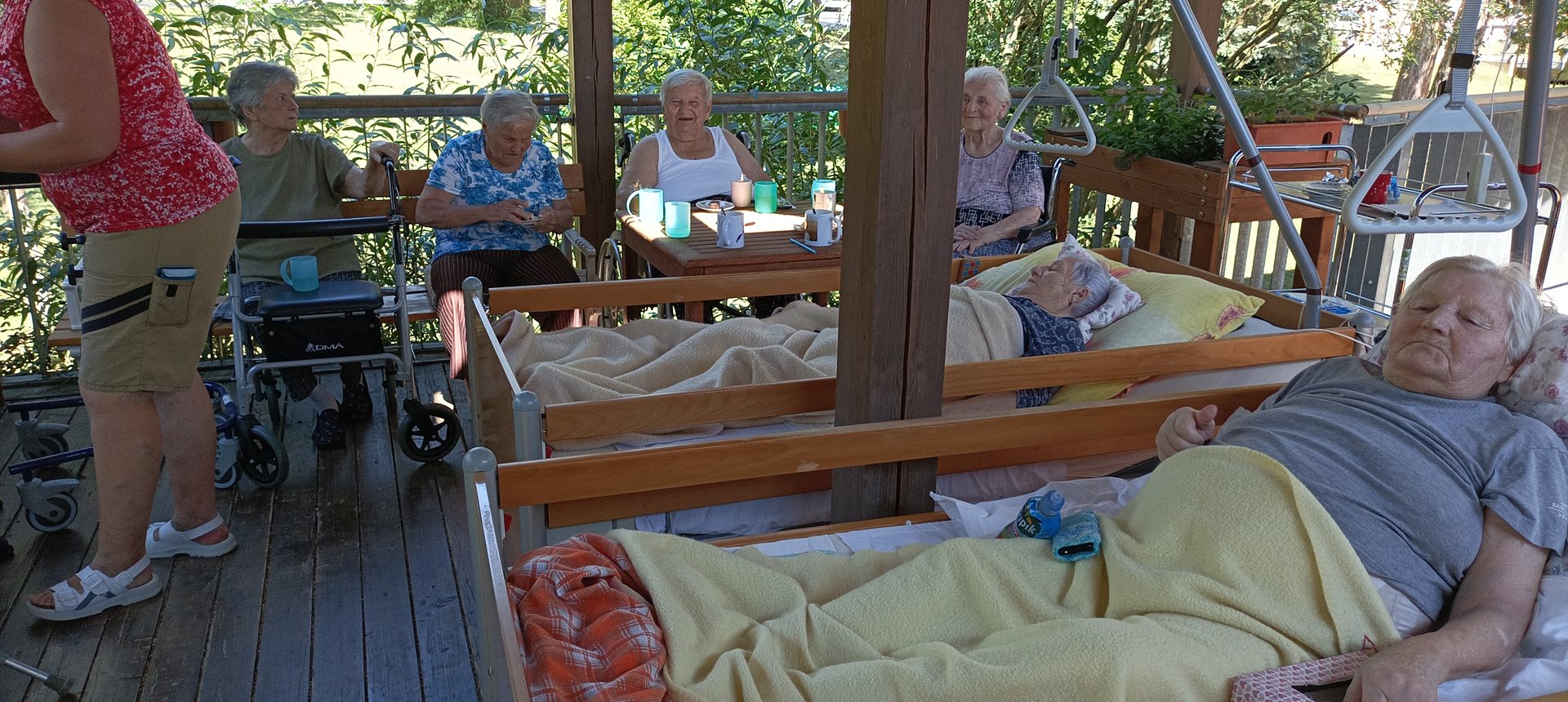 Již dříve jsme psali o tom, že když je počasí přívětivé, vozíme naše uživatele, kterým jejich zdravotní stav nedovoluje se volně pohybovat po pavilonu či trávit hodiny vsedě v křesle, ven před budovu či na altánek na lůžkách. Letní dny se nyní často předhánějí v tom, který z nich bude nejteplejší a úmornější, ale když se mírně ochladí, hned vyrážíme s uživateli na procházku či na altánek. Zde si pak mohou dát šálek dobré kávy/čaje, sníst si zde svou odpolední svačinku nebo je jim donesen nanuk k zakoupení. Dobré jídlo a pití vždy rozvíří dobrou náladu, a tak se uživatelé pod taktovkou pečovatelek často dávají do zpěvu. Za příjemného počasí tak můžete slyšet zpěv lidových písní našich uživatelek na altánku, který se nese do všech koutů parku.
